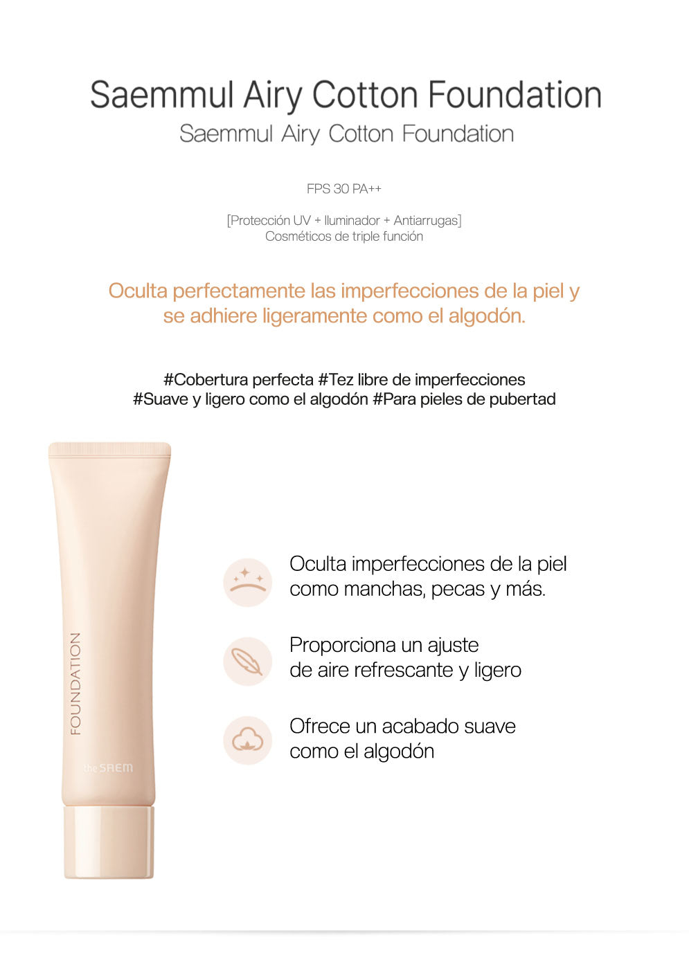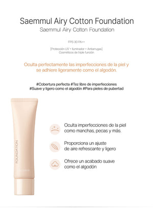 La Saemmul Airy Cotton Foundation ofrece una cobertura hermosa y natural con una sensación sorprendentemente ligera. Ideal si buscas una base que perfeccione el tono sin sentirse pesada.
